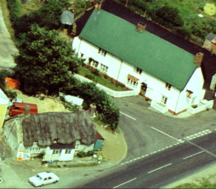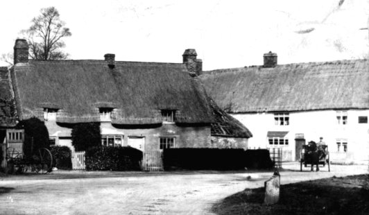 | The Red Lion (right) behind the blacksmiths' forge: about 1900 | The Red Lion (right) and part of Finmere Garage/Smithy in 1971 |